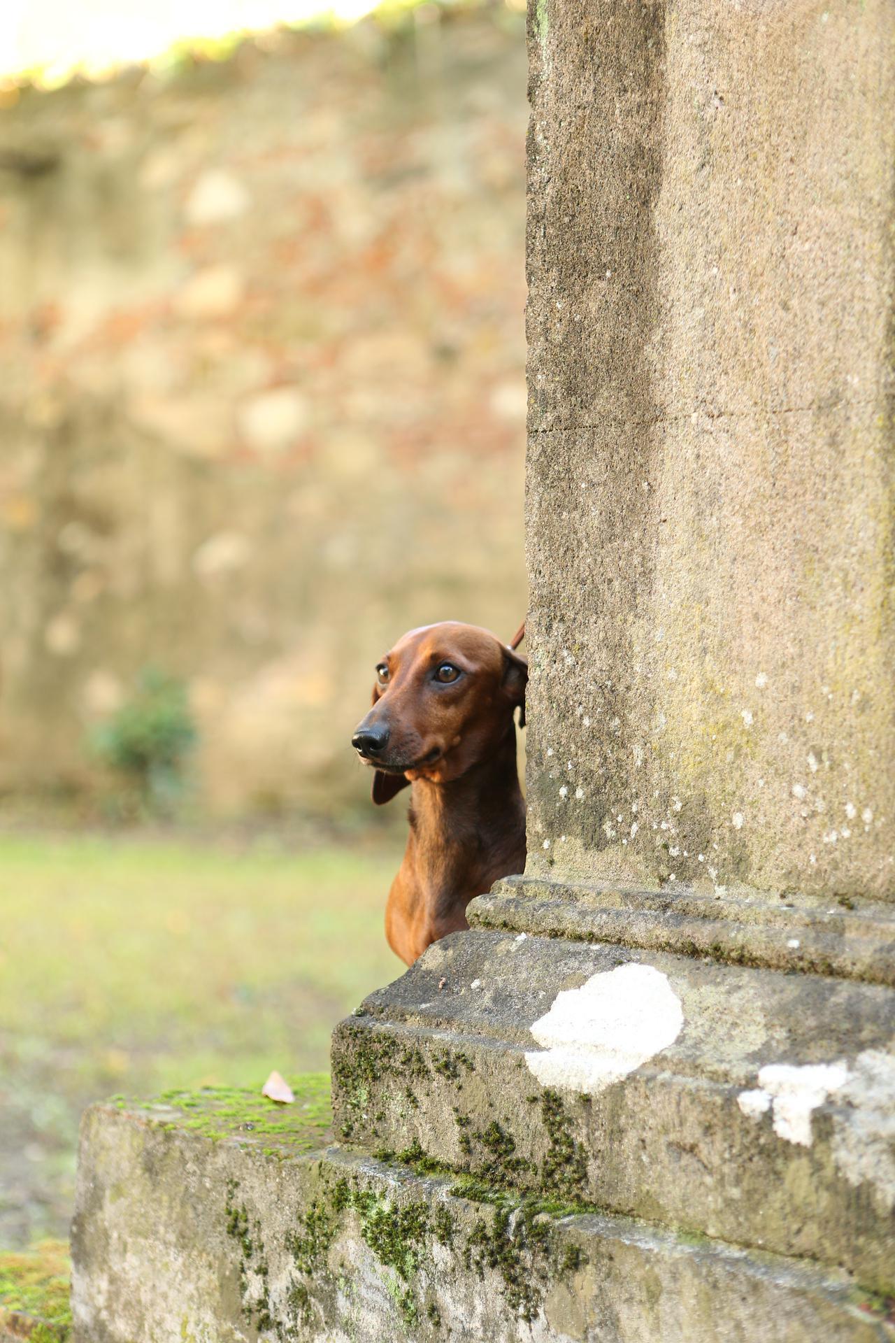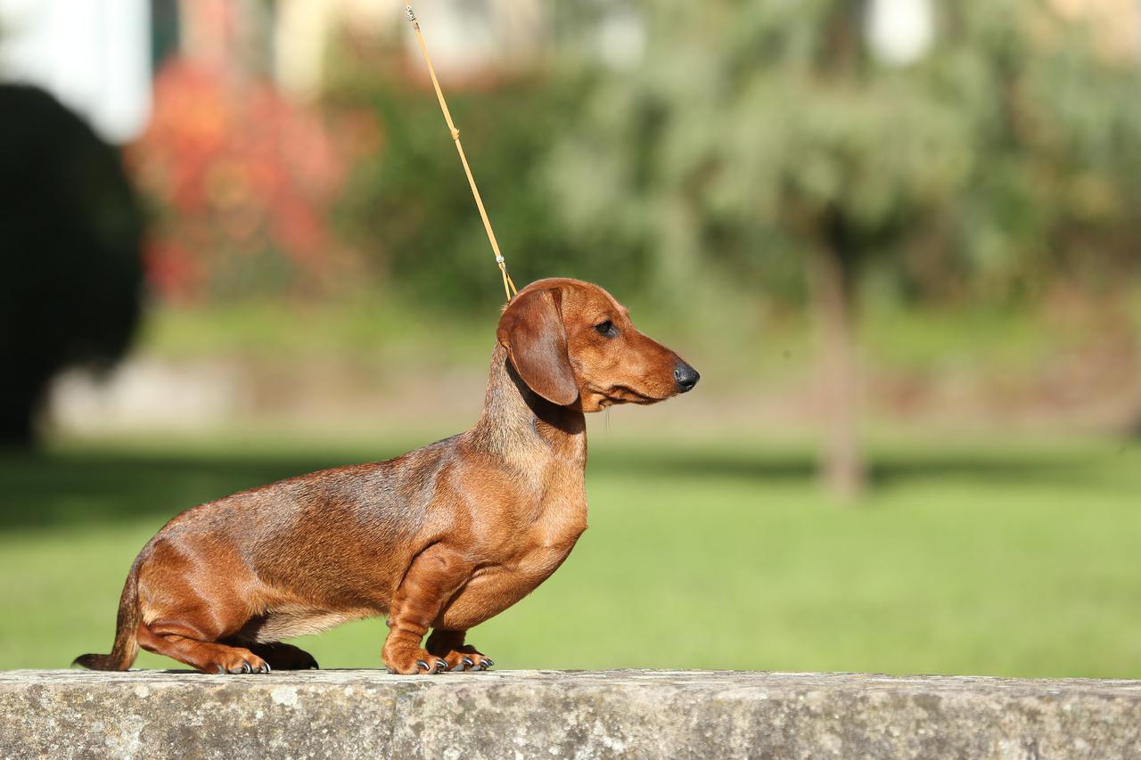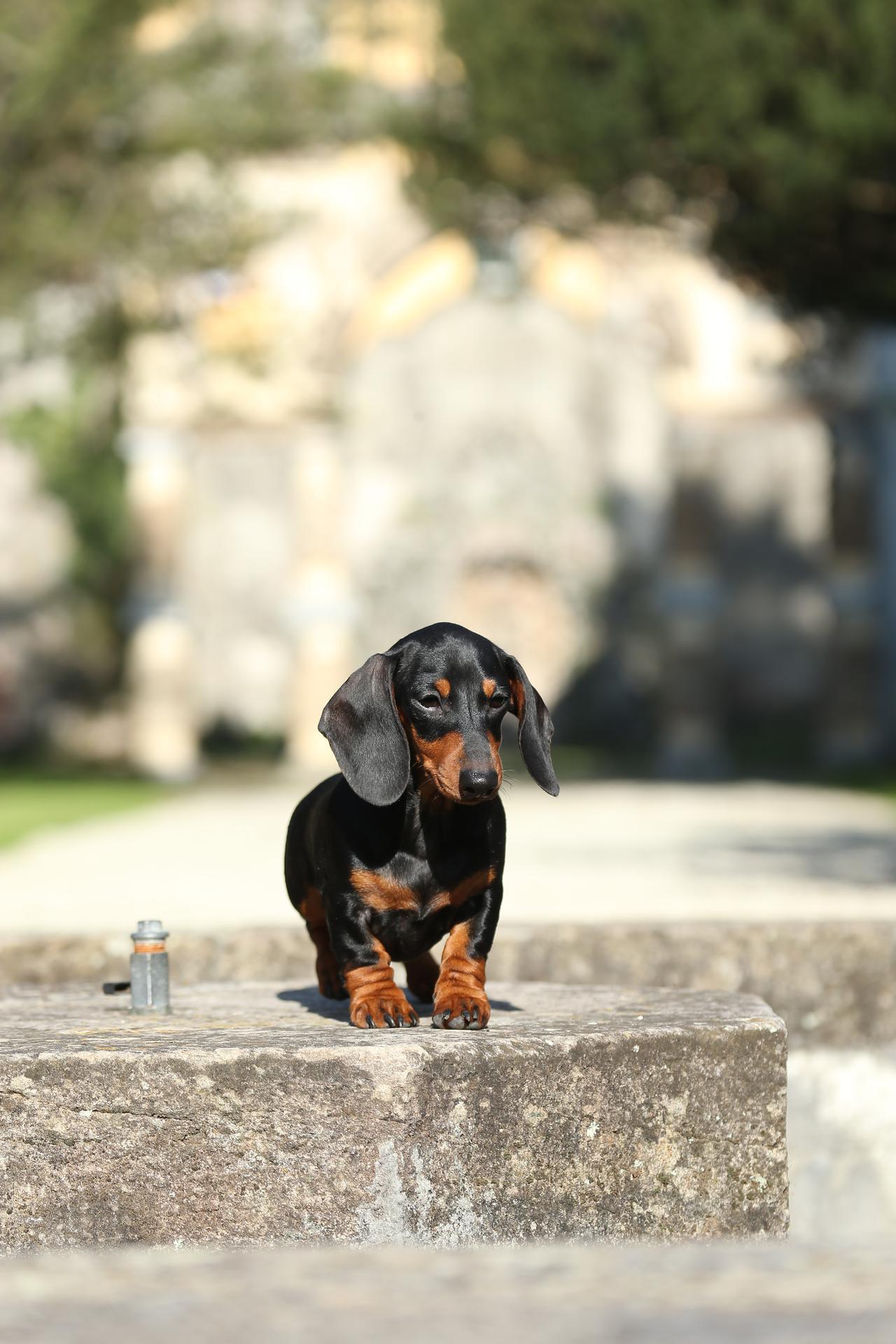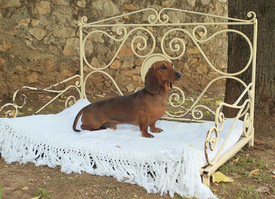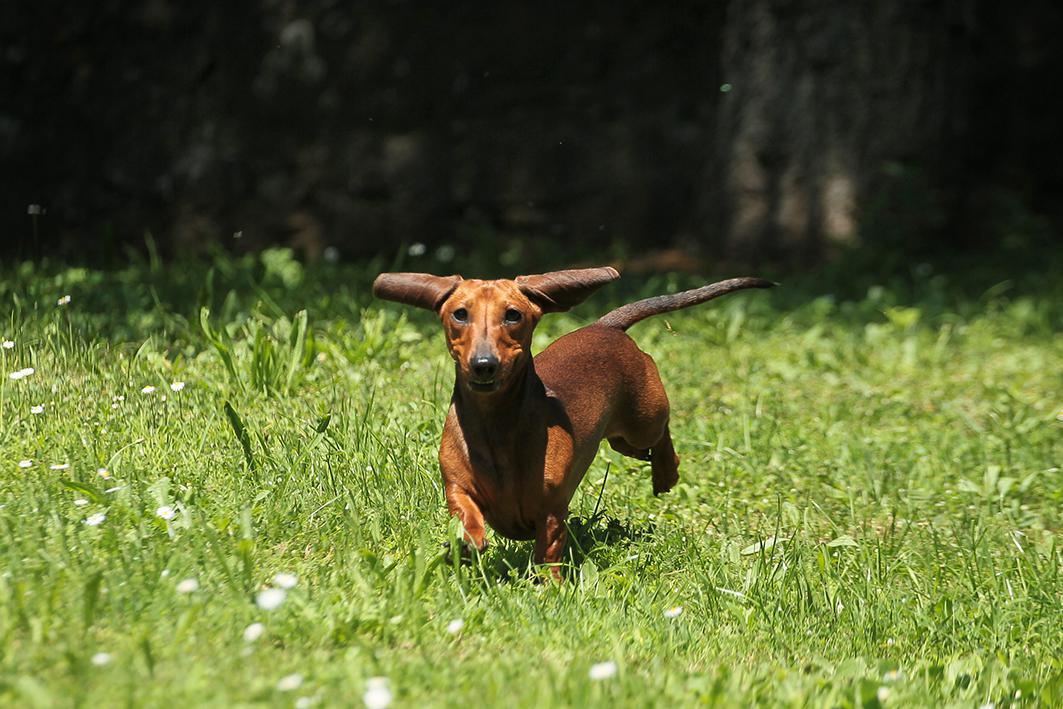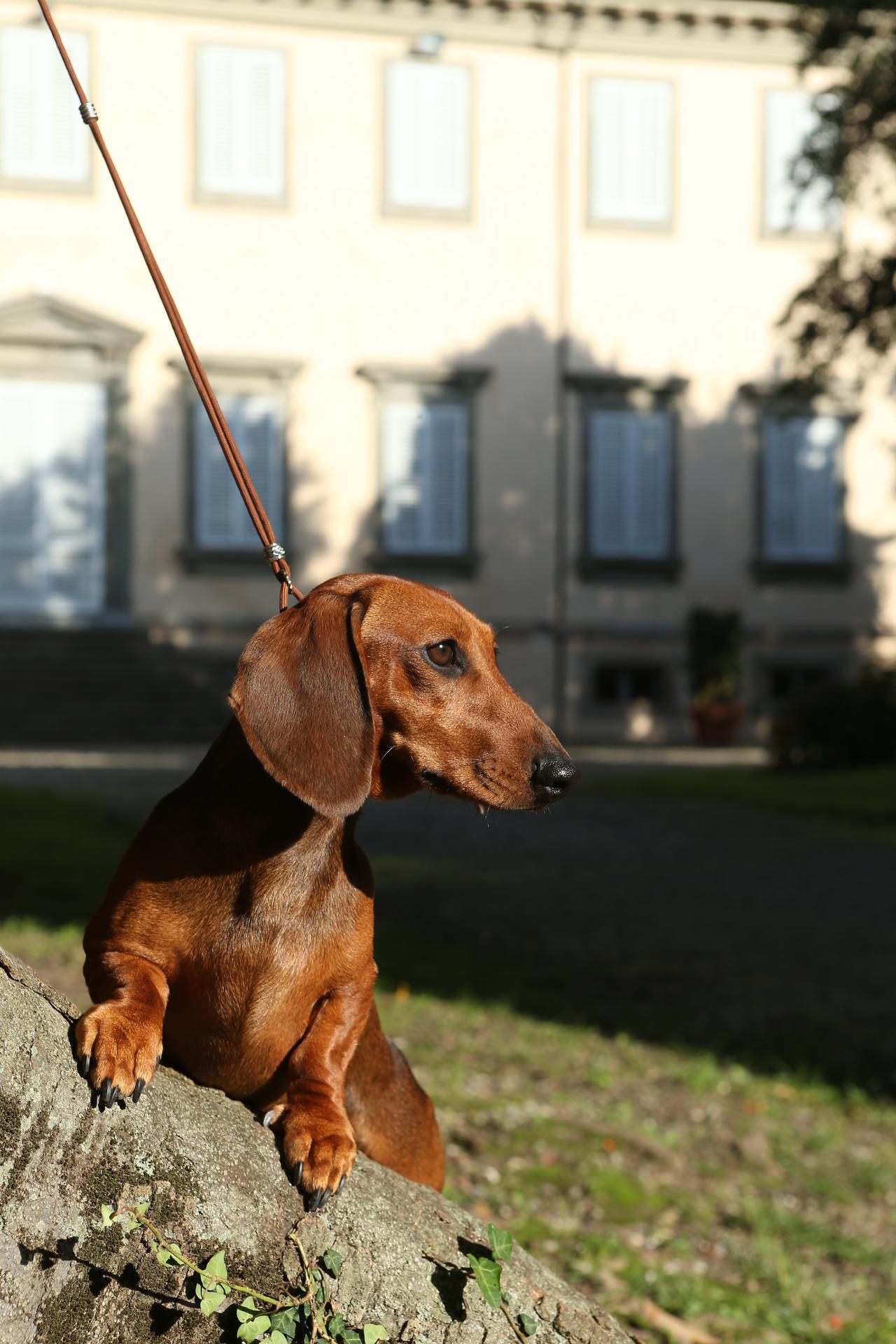 scatti professionali che celebrano la bellezza del Bassotto DIENGEL’S tra luce, verde e atmosfera.